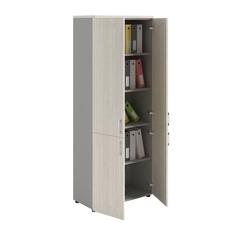 С эргономичными металлическими ручками и дверями, открывающимися на 110 градусов с доводчиками, использование шкафа становится комфортным и плавным. Профилированные полки обладают высокой стабильностью, благодаря прочным полкодержателям. Этот функциональный и стильный шкаф идеально впишется в ваш офис или домашний кабинет.