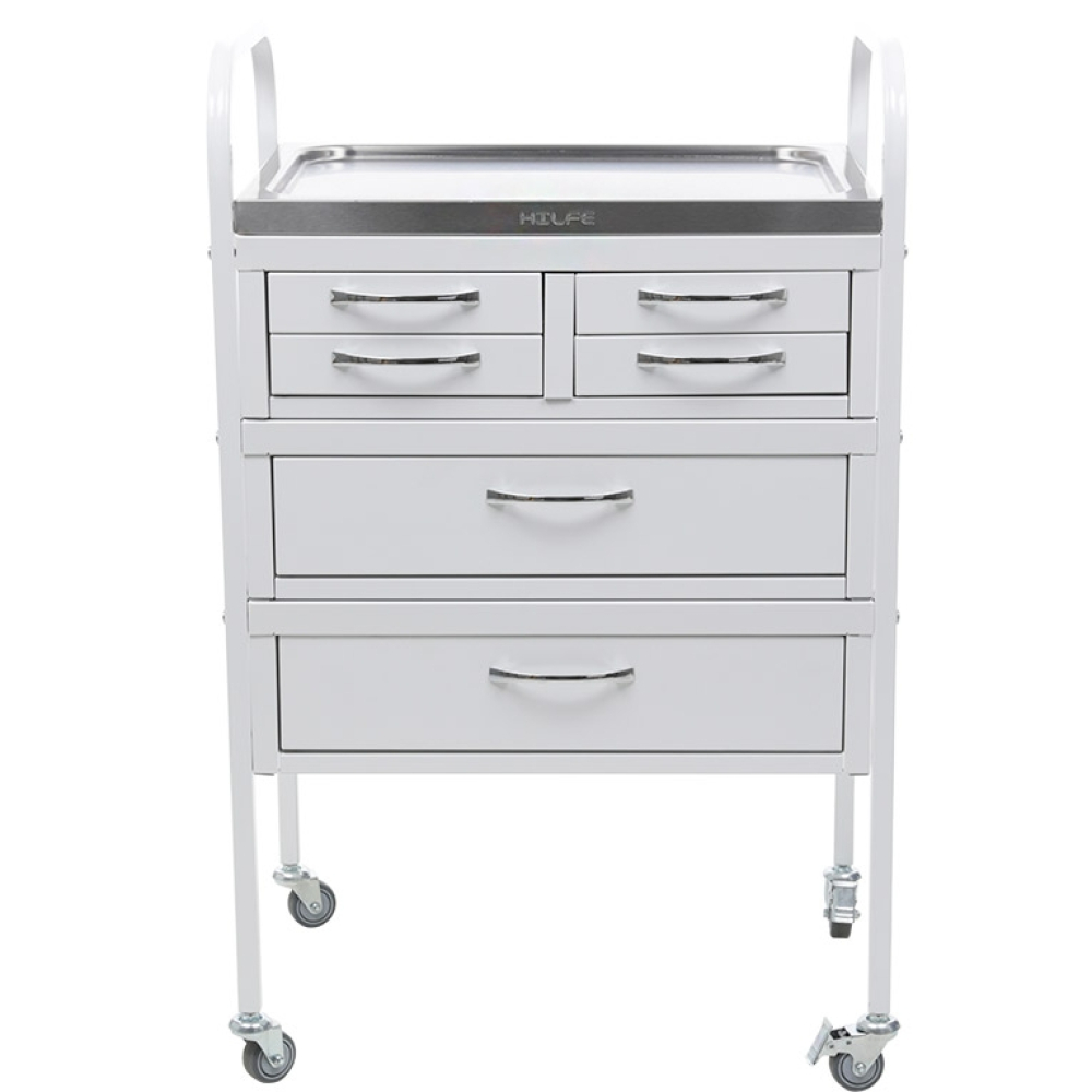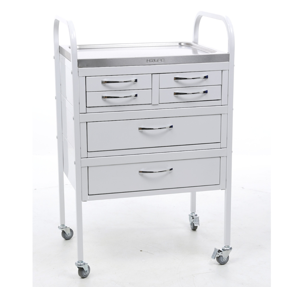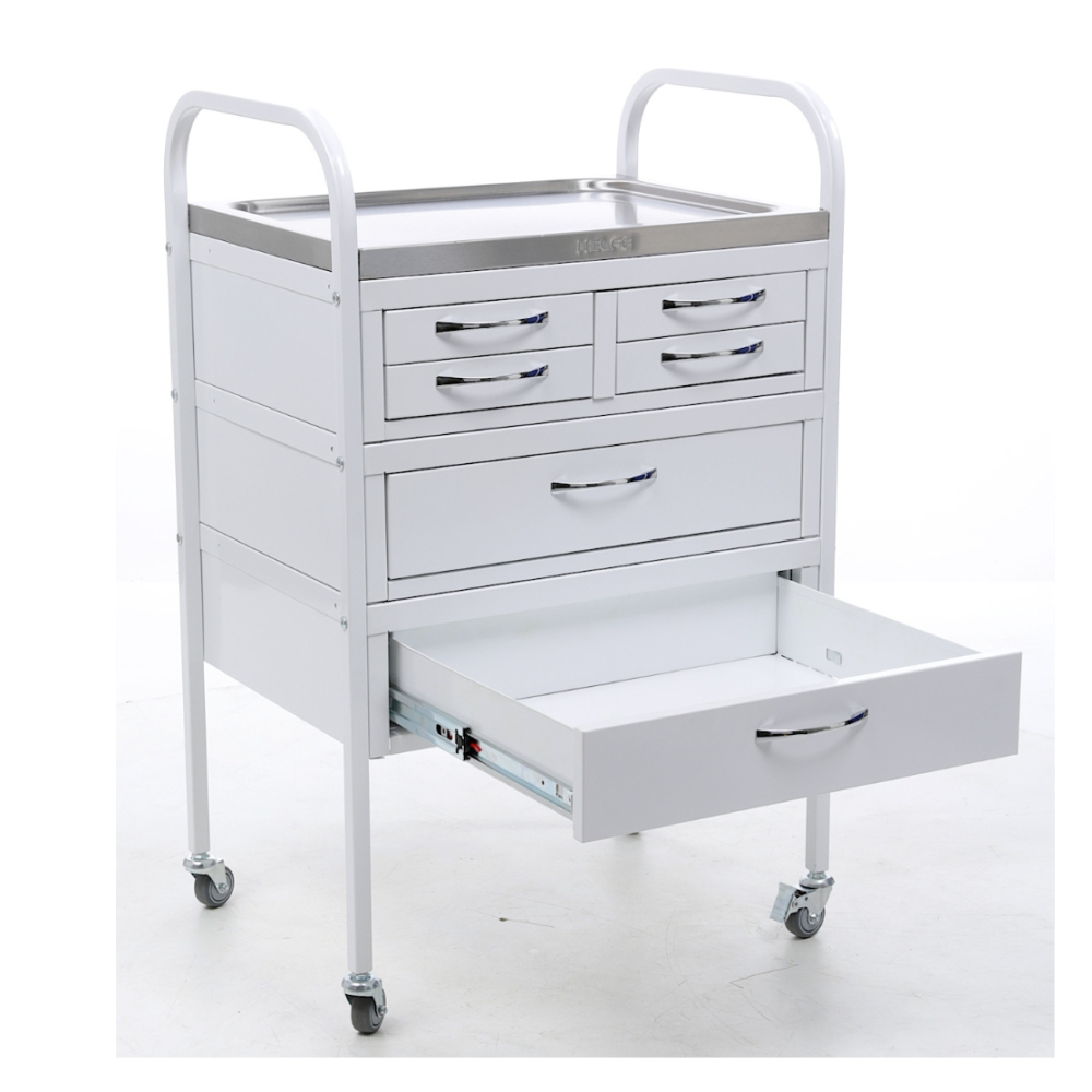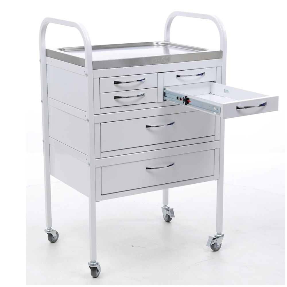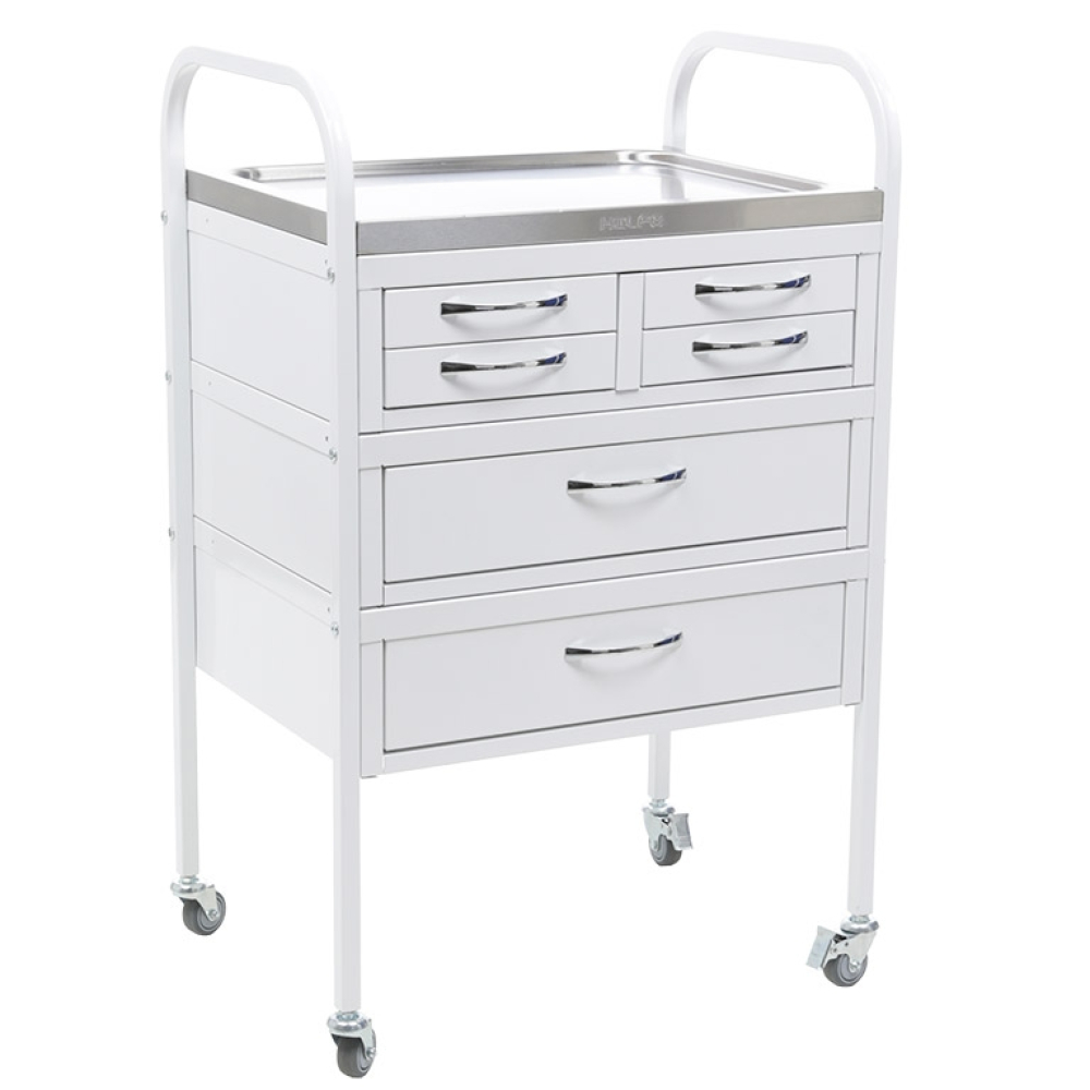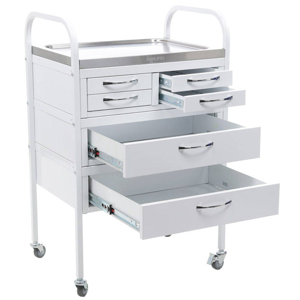 Стол манипуляционный MD SM 6 используется в медучреждениях для удобного размещения и перевозки медицинских инструментов, препаратов и приборов. Дугообразные стойки изготовлены из профильной трубы и оборудованы колесами. Верхние дуги стоек используются в качестве ручек. Стол оборудован двумя большими и четырьмя маленькими ящиками с телескопическими направляющими. Верхняя полка изготовлена из нержавеющей стали и оснащена боковыми бортиками, которые препятствуют падению предметов.