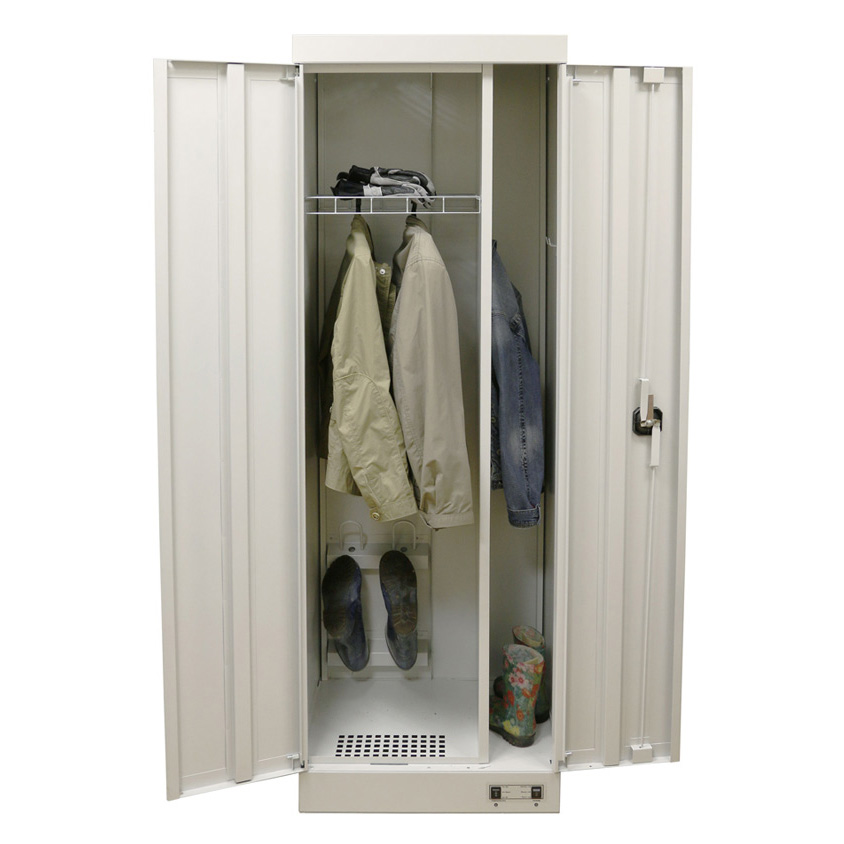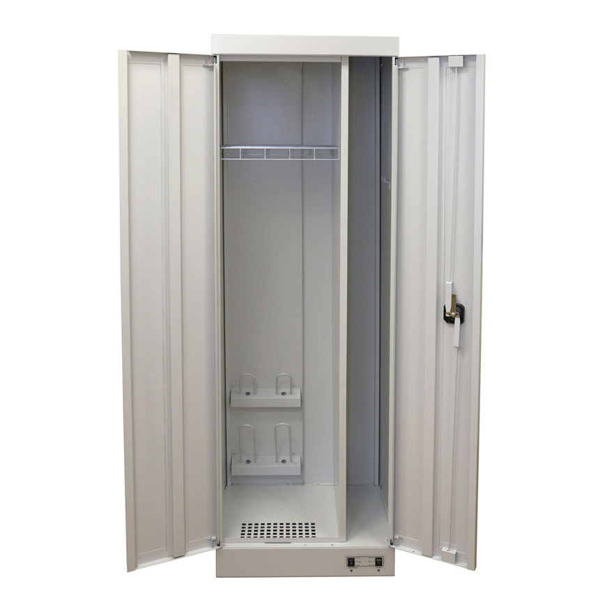 - Верхняя часть корпуса разделена глухой перегородкой на отделение для сушки одежды и отделение для хранения спортивного инвентаря (например лыж) и закрывается двумя дверьми, в одной из которых установлен ригельный замок, запирающий одновременно обе двери. Внутри отделение для одежды снабжено съемной сетчатой полкой для подвешивания плечиков с одеждой, держателями для обуви и перчаток.