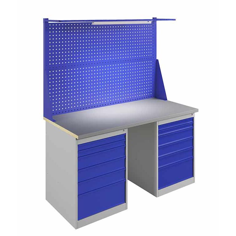 Корпус тумбы, столешница – серый (RAL 7038, шагрень), ящики тумбы, экран, косынки – синий (RAL 5002, шагрень)